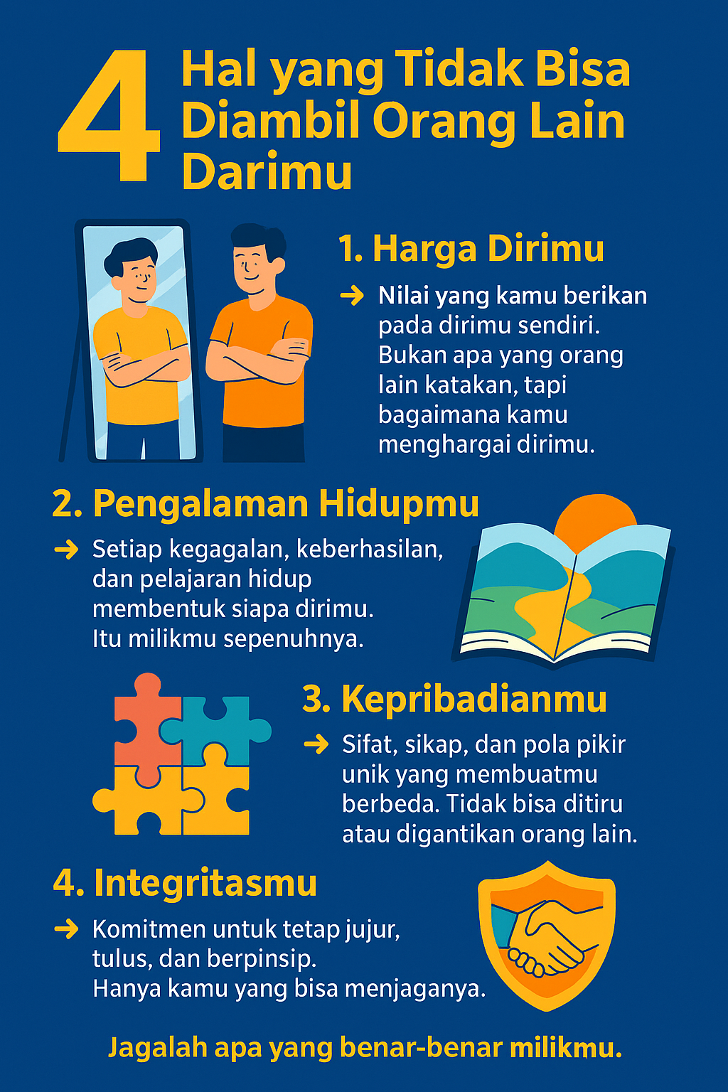 Setiap langkah, kesalahan, keberhasilan, maupun kegagalan adalah bagian dari perjalanan unikmu. Semua pengalaman itu tidak bisa direbut atau diubah oleh siapa pun. Justru, dari pengalamanlah kamu tumbuh menjadi pribadi yang kuat, bijak, dan berbeda dari orang lain.