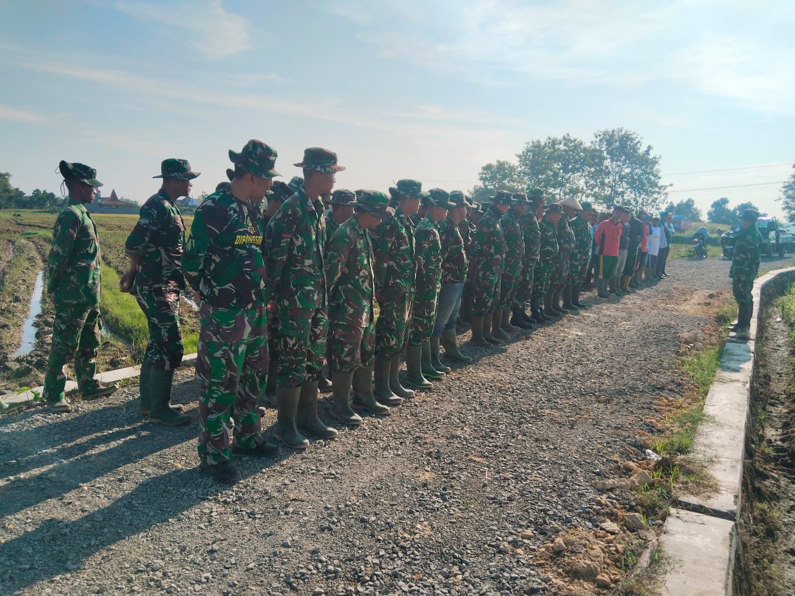Kegiatan apel pagi tersebut tidak hanya diikuti oleh anggota Satgas TMMD, tetapi juga melibatkan perangkat desa dan perwakilan masyarakat setempat yang turut bergotong royong dalam pelaksanaan program pembangunan.
